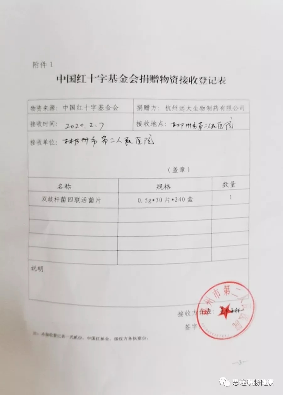 在得知防疫一線(xiàn)急需微生態(tài)藥品后,2020年2月6日,杭州遠(yuǎn)大生物制藥有限公司立即啟動(dòng)捐贈(zèng)程序,決定第一批捐贈(zèng)價(jià)值100萬(wàn)元的雙歧桿菌四聯(lián)活菌片(思連康),專(zhuān)項(xiàng)用于疫區(qū)新型冠狀病毒肺炎的防治。目前第一批價(jià)值100萬(wàn)元雙歧桿菌四聯(lián)活菌片(思連康)已全部送達(dá)湖北、浙江、湖南等地醫(yī)院;第二批價(jià)值130萬(wàn)元的思連康(雙歧桿菌四聯(lián)活菌片)也已于昨日(2月12日)開(kāi)始配送醫(yī)院。