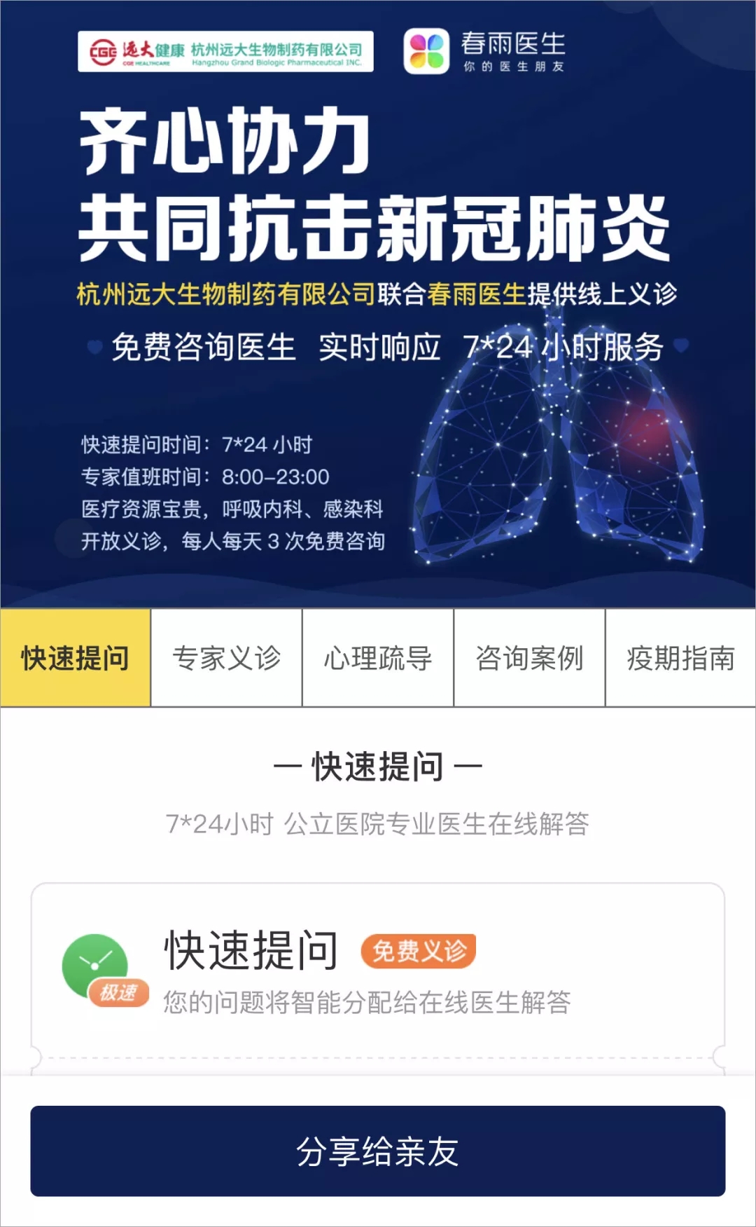 杭州遠(yuǎn)大生物制藥有限公司聯(lián)合國(guó)內(nèi)多家知名醫(yī)療在線(xiàn)垂直領(lǐng)域問(wèn)診平臺(tái)春雨醫(yī)生、快速問(wèn)醫(yī)生、妙手醫(yī)生共同發(fā)起免費(fèi)在線(xiàn)義診活動(dòng)