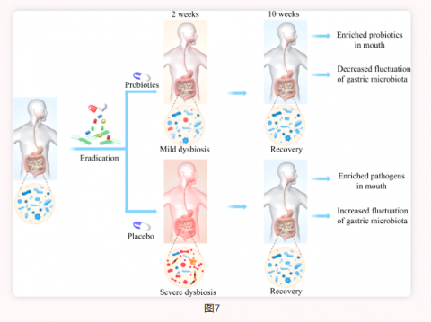 結(jié)果顯示: 思連康雙歧桿菌四聯(lián)活菌片組胃腸道不良反應(yīng)發(fā)生率低于安慰劑組(23.6% vs 37.7%,p =0.016)。除此之外,在根除后,腸道菌群結(jié)構(gòu)發(fā)生了劇烈的變化,變形菌門取代了共生厚壁菌門和擬桿菌門,并在兩周后逐漸恢復(fù)。補(bǔ)充思連康雙歧桿菌四聯(lián)活菌片可中和根除藥物所帶來(lái)的腸道擬桿菌門的減少,使胃菌群的波動(dòng)更加平穩(wěn),抑制口腔致病菌的生長(zhǎng)。 01思連康減少Hp根除后不良反應(yīng) 與安慰劑組相比,雙歧桿菌四聯(lián)活菌片組胃腸道不良反應(yīng)的總體發(fā)生率顯著降低(23.62% vs 37.7%,p =0.016),且安慰劑組惡心嘔吐發(fā)生率高于雙歧桿菌四聯(lián)活菌片組(24.59% vs 13.39% ,p =0.024)(圖1)。 02思連康緩解Hp根除后的腸道菌群紊亂 03思連康可使Hp根除后胃菌群波動(dòng)減小 04思連康可抑制Hp根除后口腔致病菌生長(zhǎng) 越來(lái)越多的證據(jù)提示,根除幽門螺桿菌感染的鉍劑四聯(lián)療法會(huì)導(dǎo)致腸道菌群穩(wěn)態(tài)的短期受損。《第六次全國(guó)幽門螺桿菌感染處理共識(shí)報(bào)告》明確指出,根除治療可改變腸道微生物種群的多樣性和結(jié)構(gòu)。 本次研究顯示: 頓服思連康雙歧桿菌四聯(lián)活菌片,可降低胃腸道不良反應(yīng)的發(fā)生率。 根除幽門螺桿菌后,唾液、胃和腸道的微生物菌群組成發(fā)生顯著變化,停用抗生素兩周后腸道菌群恢復(fù)到基線水平。通過(guò)頓服思連康雙歧桿菌四聯(lián)活菌片治療,可使微生物菌群的紊亂得到緩解(圖7)。這為幽門螺桿菌治療方案的進(jìn)一步優(yōu)化以及副作用的減輕提供了新的臨床應(yīng)用方向和思路。 [1] YUAN Z, XIAO S, LI S, et al. The impact of Helicobacter pylori infection, eradication therapy, and probiotics intervention on gastric microbiota in young adults [J]. Helicobacter, 2021, 26(6): e12848. [2] SALAMA N R, HARTUNG M L, MüLLER A. Life in the human stomach: persistence strategies of the bacterial pathogen Helicobacter pylori [J]. Nature reviews Microbiology, 2013, 11(6): 385-99. [3] BANG C S, LIM H, JEONG H M, et al. Amoxicillin or tetracycline in bismuth-containing quadruple therapy as first-line treatment for Helicobacter pylori infection [J]. Gut microbes, 2020, 11(5): 1314-23. [4] YE Q, SHAO X, SHEN R, et al. Changes in the human gut microbiota composition caused by Helicobacter pylori eradication therapy: A systematic review and meta-analysis [J]. Helicobacter, 2020, 25(4): e12713. [5] CHEN C C, LIOU J M, LEE Y C, et al. The interplay between Helicobacter pylori and gastrointestinal microbiota [J]. Gut microbes, 2021, 13(1): 1-22. [6] ZHAO Y, YANG Y, ARUNA, et al. Saccharomyces boulardii Combined With Quadruple Therapy for Helicobacter pylori Eradication Decreased the Duration and Severity of Diarrhea: A Multi-Center Prospective Randomized Controlled Trial [J]. Frontiers in medicine, 2021, 8: 776955. [7] PLOMER M, III PEREZ M, GREIFENBERG D M. Effect of Bacillus clausii Capsules in Reducing Adverse Effects Associated with Helicobacter pylori Eradication Therapy: A Randomized, Double-Blind, Controlled Trial [J]. Infectious diseases and therapy, 2020, 9(4): 867-78. [8] YANG C, LIANG L, LV P, et al. Effects of non-viable Lactobacillus reuteri combining with 14-day standard triple therapy on Helicobacter pylori eradication: A randomized double-blind placebo-controlled trial [J]. Helicobacter, 2021, 26(6): e12856. [9]《第六次全國(guó)幽門螺桿菌感染處理共識(shí)報(bào)告》
