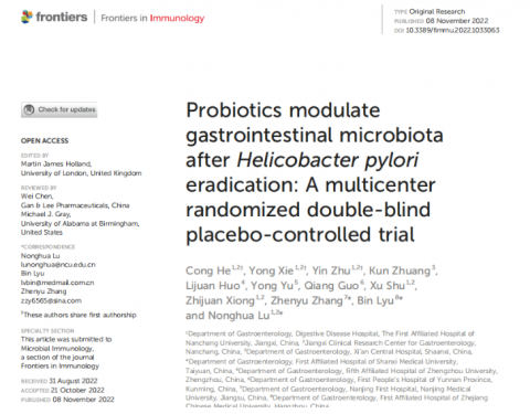 南昌大學(xué)第一附屬醫(yī)院呂農(nóng)華教授牽頭,包括西安市中心醫(yī)院、山西醫(yī)科大學(xué)第一附屬醫(yī)院、鄭州大學(xué)第五附屬醫(yī)院、云南省第一人民醫(yī)院、南京醫(yī)科大學(xué)附屬南京醫(yī)院及浙江中醫(yī)藥大學(xué)第一附屬醫(yī)院在內(nèi)的全國(guó)七家三甲醫(yī)院共同開(kāi)展了一項(xiàng)為期兩年八個(gè)月的多中心、隨機(jī)、雙盲、安慰劑對(duì)照研究,并在2022年11月Frontiers in Immunology(IF:8.786)發(fā)表了題為”P(pán)robiotics modulate gastrintestinal microbiota after Helicobacter pylori eradication:A multicenter randomized double-blind placebo-controlled trial”的研究論文。旨在進(jìn)一步明確思連康雙歧桿菌四聯(lián)活菌片聯(lián)合14天含鉍劑四聯(lián)療法根除幽門螺桿菌的療效和安全性,以及對(duì)胃腸道菌群變化的影響。